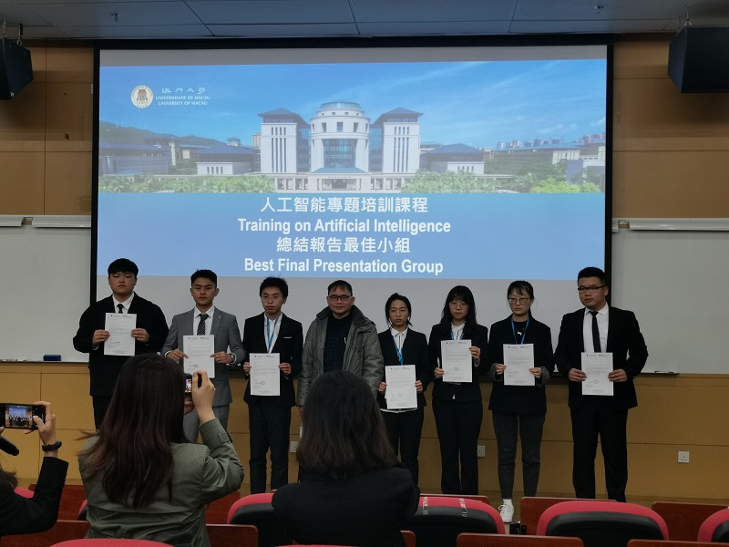出行之前,带队老师和参访员工认真参加国际合作交流处组织的行前会,做好出境访学的充分准备。访学期间,williamhill官网的10名员工参加了澳门大学的人工智能项目课程学习。在澳门大学教授的全英文授课中,同学们勇于接受挑战,对课程几大主题“Big data and Artificial Intelligence”, “Intelligent Sensing and Wireless Communication Based on Big Data ”等进行充分的课前预习,课后小组及时研讨,充分锻炼了自主学习、团队协作的能力。在课程结业汇报环节,张謇202班徐权杰同学带领组员获得人工智能专题培训课程总结报告最佳小组,并顺利获得澳门大学教授的推荐信,评委老师对小组创意予以充分肯定。结业典礼上,202班顾豪杰同学作为人工智能组员工代表发言,获得师生一致好评。