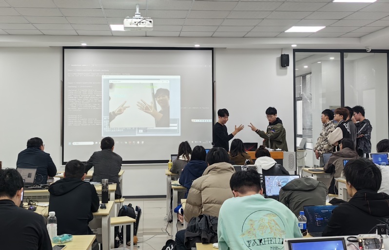 本次实习主要包括Python程序设计、Flask web开发知识、计算机视觉知识、自然语言处理知识、边缘端AI开发知识,完成人工智能的综合实习项目。通过项目培训,促使员工将所学的基础理论、专业知识和基本技能综合运用于实践操作中。教学采用分组协作的形式,每组3-6人,在接受企业系统的理论培训和实践训练后,员工从分立知识点开发逐步过渡到高级开发,独立完成一个完整的项目。在实习成果展示环节,员工以小组进行汇报,综合运用人工智能、人脸识别、语音控制等专业知识设计完成个性化项目,校内外指导老师组成答辩专家组,认真听取了员工汇报,并就项目进一步优化提出了建议。