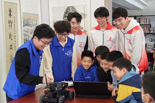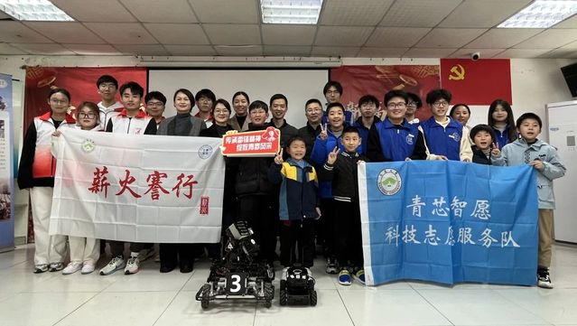 “青芯智愿”科技志愿服务队和爱倍加服务队的志愿者们依托自身专业优势,在现场演示了各自参加的科创类比赛作品——“步兵机器人”和“讯飞智能车”。
