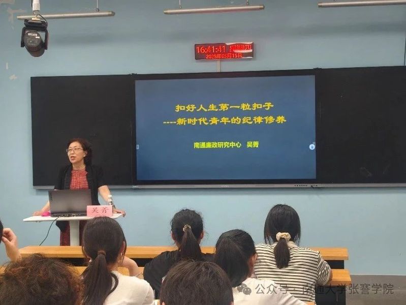 5月15日,南通廉政研究中心顾问吴菁教授作《扣好人生的第一粒扣子—— 新时代青年的纪律修养》讲座。她系统阐述党的纪律相关内容,详细讲解政治纪律、组织纪律、廉洁纪律、群众纪律、工作纪律、生活纪律六大纪律,介绍党的纪律处分条例有关内容,并通过典型案例,强调加强纪律修养要以好学为本、以自省为要、以躬行为重,提醒学员时刻牢记“常修为政之德,常思贪欲之害,常怀律己之心”,理论和实际相结合,做对党忠诚、个人干净、敢于担当的新时代青年。