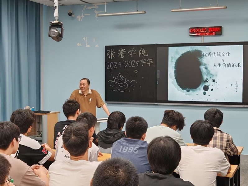 文公司原经理、图书馆原馆长丁富生教授作《优秀传统文化与人生价值追求》人文主题讲座。丁教授以张謇先生的事迹为切入点,生动讲述其状元历程,展现智慧与担当。他引用习近平总书记关于文化自信的论述,深入剖析了中国传统文化中蕴含的现代价值观,推荐《论语》等经典名著,促进同学们深刻认识到传统文化对于塑造个人正确世界观、人生观和价值观的重要意义。