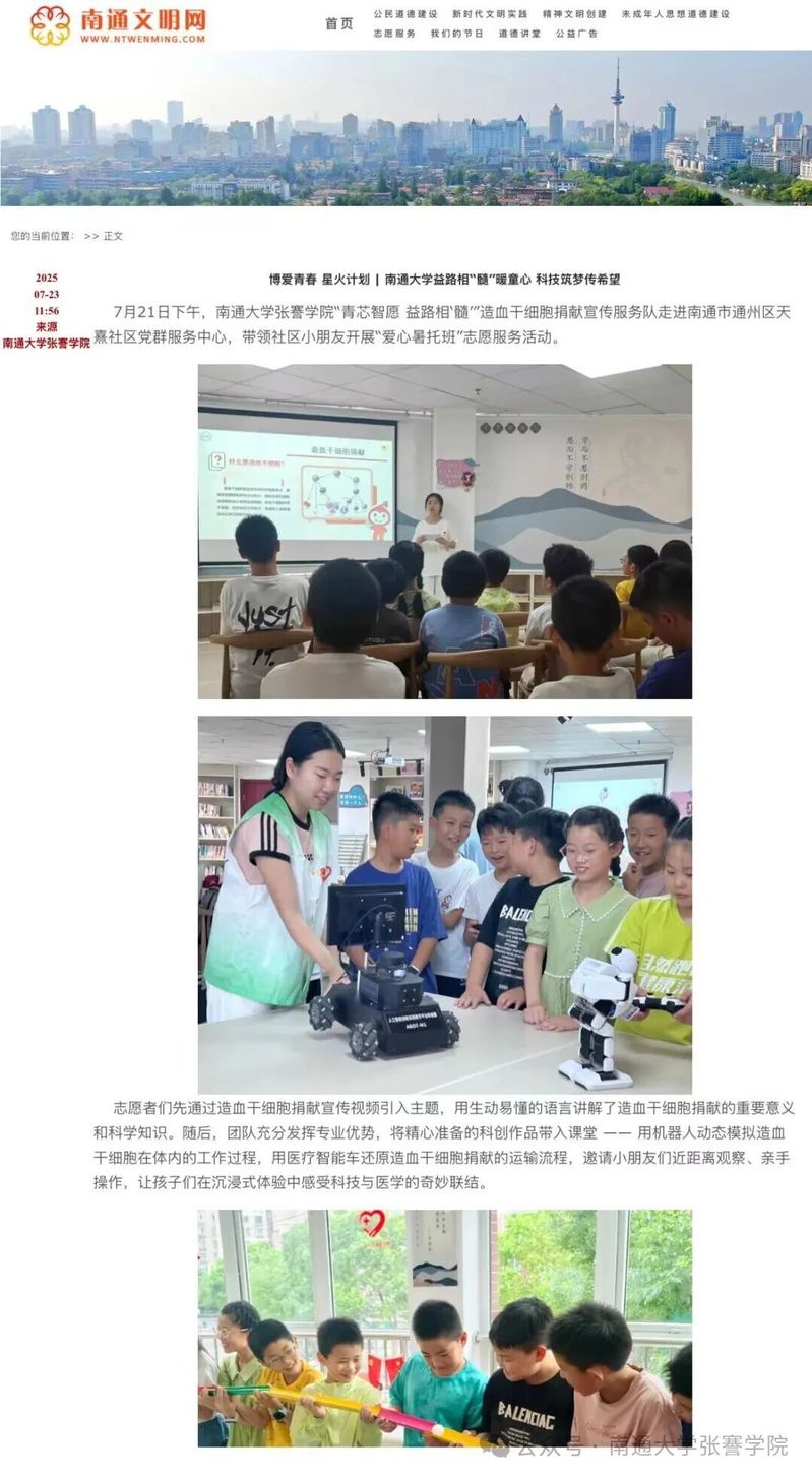 暑托传情,实践砺能。“青芯智愿・謇心乡情” 实践队走进通州区天霞社区等多个暑托班,开设文化启蒙、趣味实验、艺术创作等多元课程。团队以爱心暑托班为平台,既丰富了孩子们假期生活,又在实践中锤炼综合素养。团队活动事迹被光明日报、新华社等多家媒体报道,以“青年智愿”书写了情系童心、赋能乡村的青春答卷,让教育帮扶的温暖力量辐射更多角落。